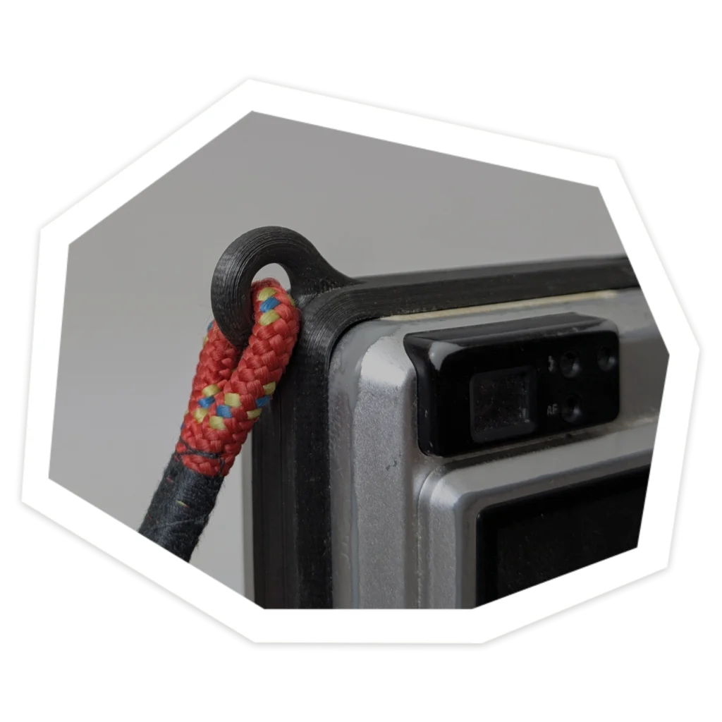 Il y a une petite dragonne fragile et vraiment pas commode (= quasi inutilisable).